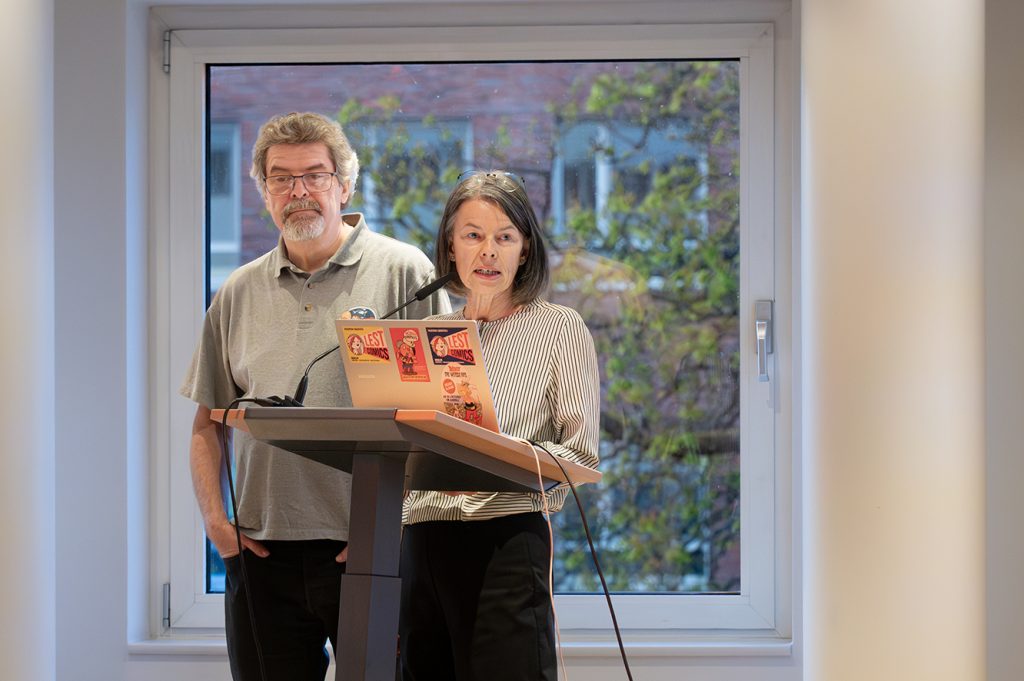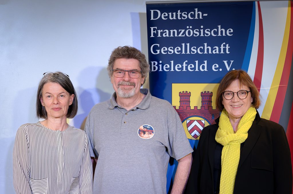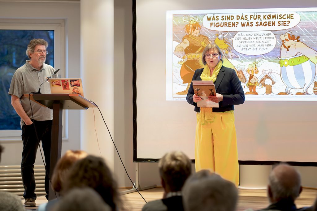 Nach freundlicher Begrüßung durch Frau Teller als Repräsentantin der Stadtbibliothek und Frau Matzke als Vorsitzende der Deutsch-Französischen Gesellschaft nahm Herr Jöken, gestützt auf zahlreiche Illustrationen, sehr humorvoll und detailliert das Publikum mit auf die Reise zur großen Kunst der Übersetzung von Asterixcomics.