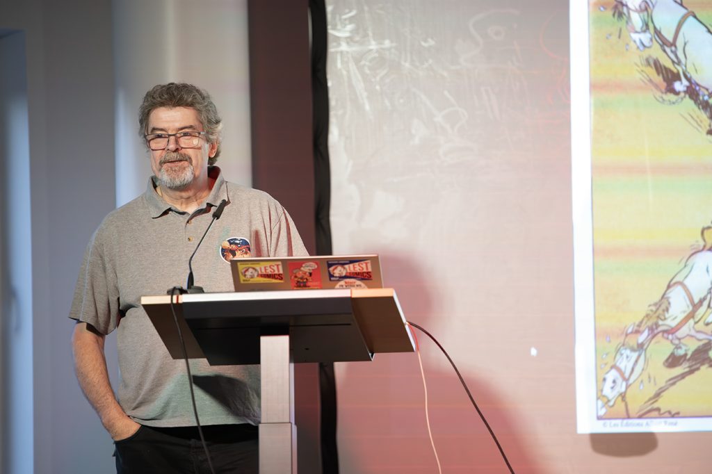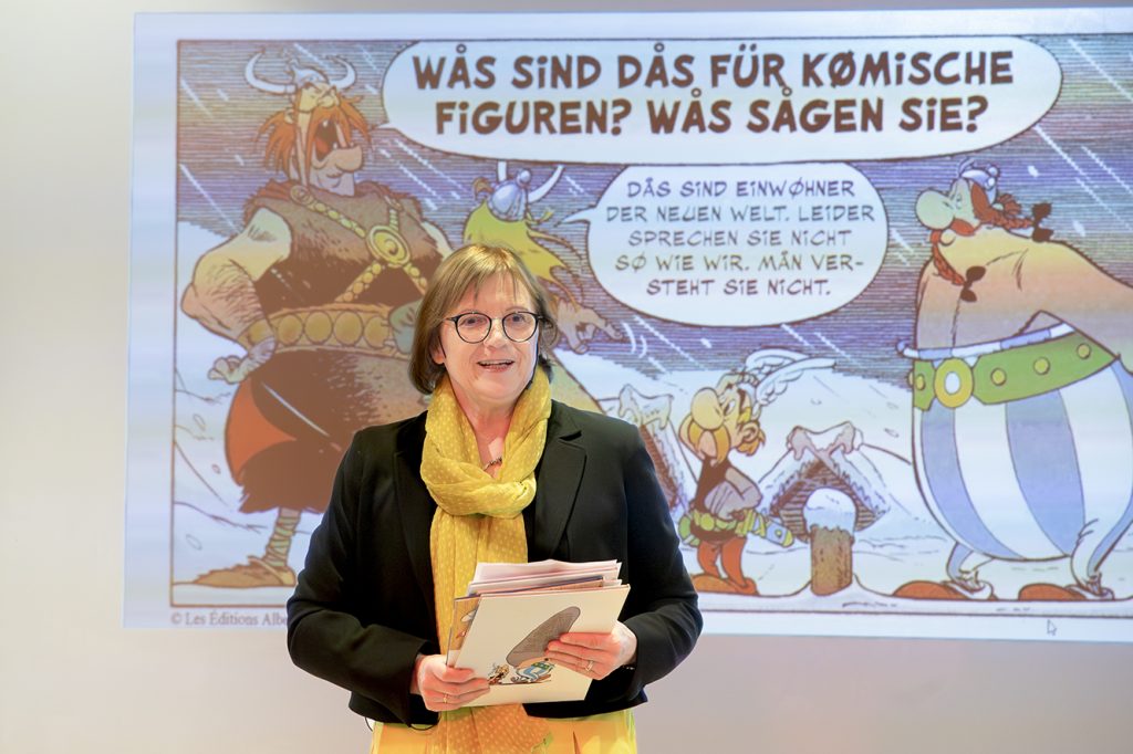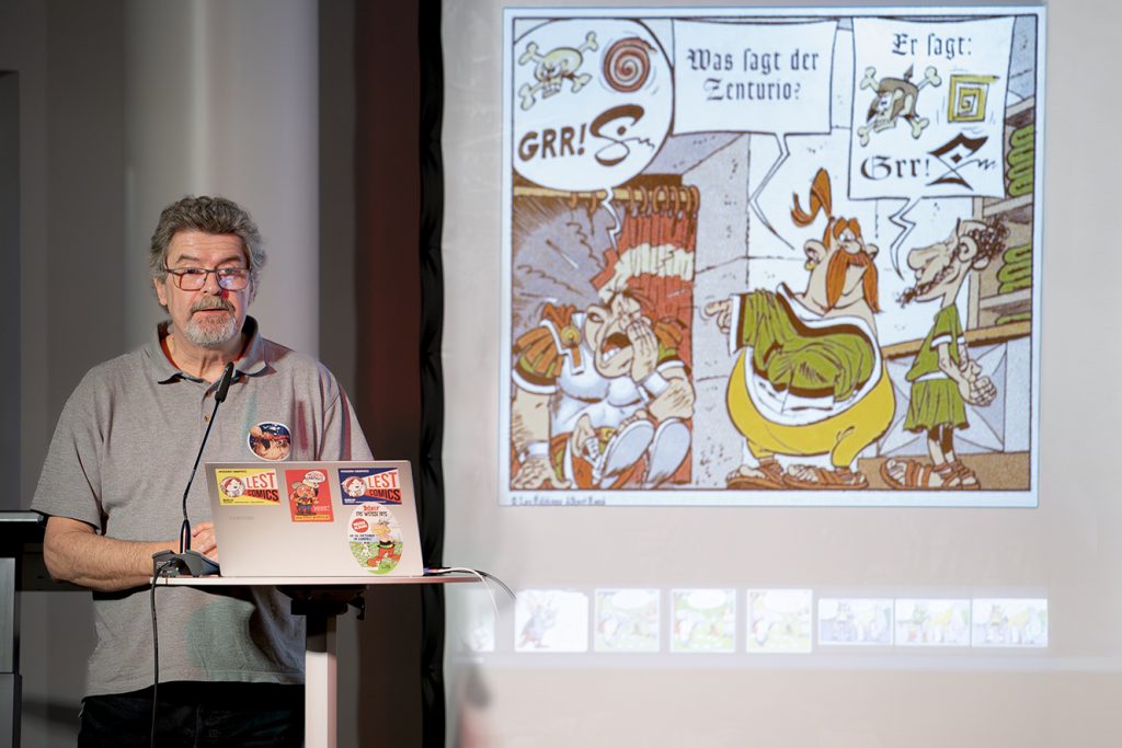 Eine wichtige Maxime bei der Übersetzung lautet: Der Text soll nicht übersetzt, sondern in eine andere Sprache übertragen werden, was dem Übersetzer einige Freiheiten gibt, muss er doch die Mentalität des Landes und die Besonderheiten der Sprache berücksichtigen. In seinem Vortrag erklärt Jöken anhand zahlreicher Bilder, wie komplex es ist, den französischen Sprachwitz ins Deutsche zu übertragen. Ein Beispiel wurde besonders ausführlich anhand des Albums Asterix