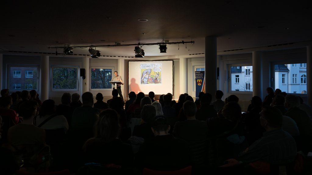 Nach einer kurzen Einführung in die Erfolgsgeschichte des kleinen Galliers und seines Freundes Obelix – die Asterixabenteuer wurden erstmals für die Jugendzeitung „Pilote“ von Goscinny als Autor und Uderzo als Zeichner geschaffen und wurden sofort berühmt – erläuterte Jöken die Bedingungen seiner Arbeit anhand vieler visueller Beispiele.