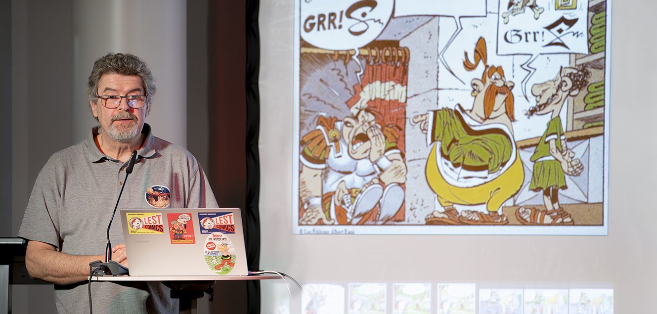 Eine wichtige Maxime bei der Übersetzung lautet: Der Text soll nicht übersetzt, sondern in eine andere Sprache übertragen werden, was dem Übersetzer einige Freiheiten gibt, muss er doch die Mentalität des Landes und die Besonderheiten der Sprache berücksichtigen. In seinem Vortrag erklärt Jöken anhand zahlreicher Bilder, wie komplex es ist, den französischen Sprachwitz ins Deutsche zu übertragen. Ein Beispiel wurde besonders ausführlich anhand des Albums Asterix