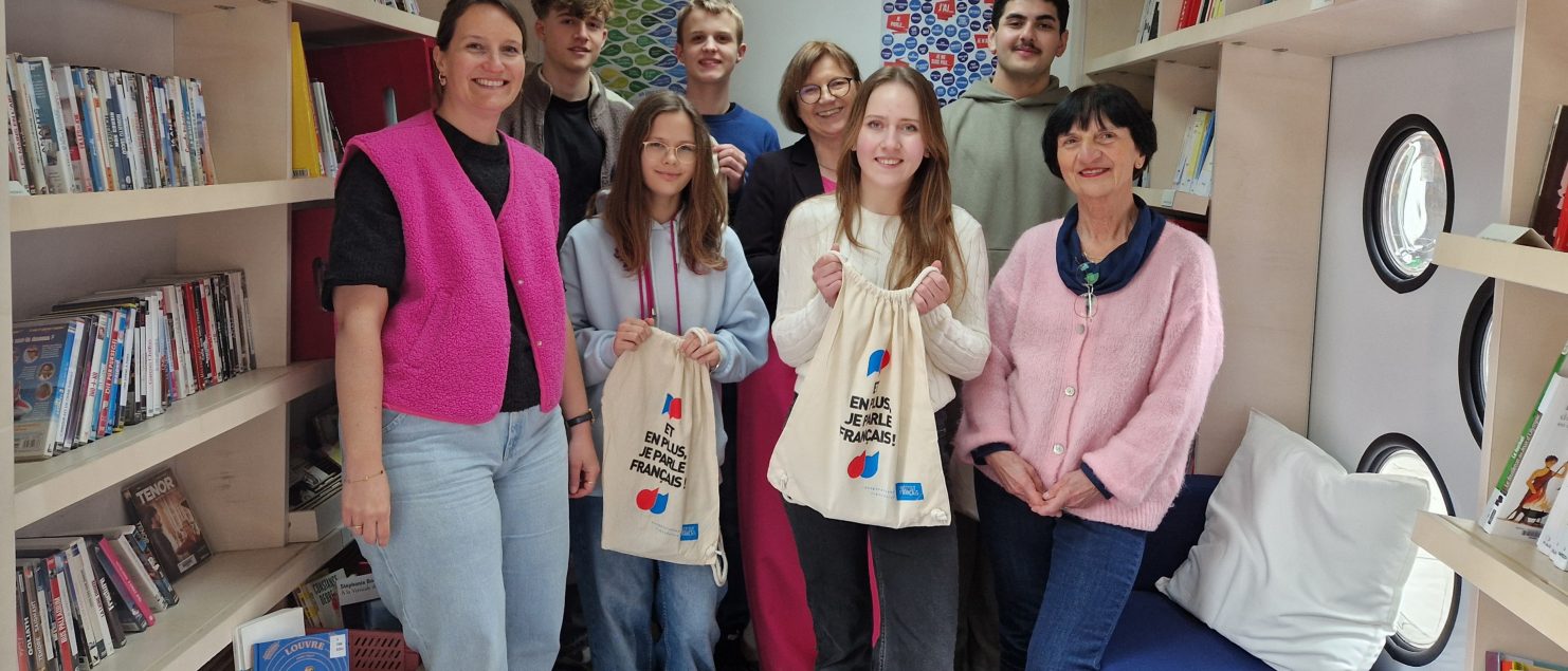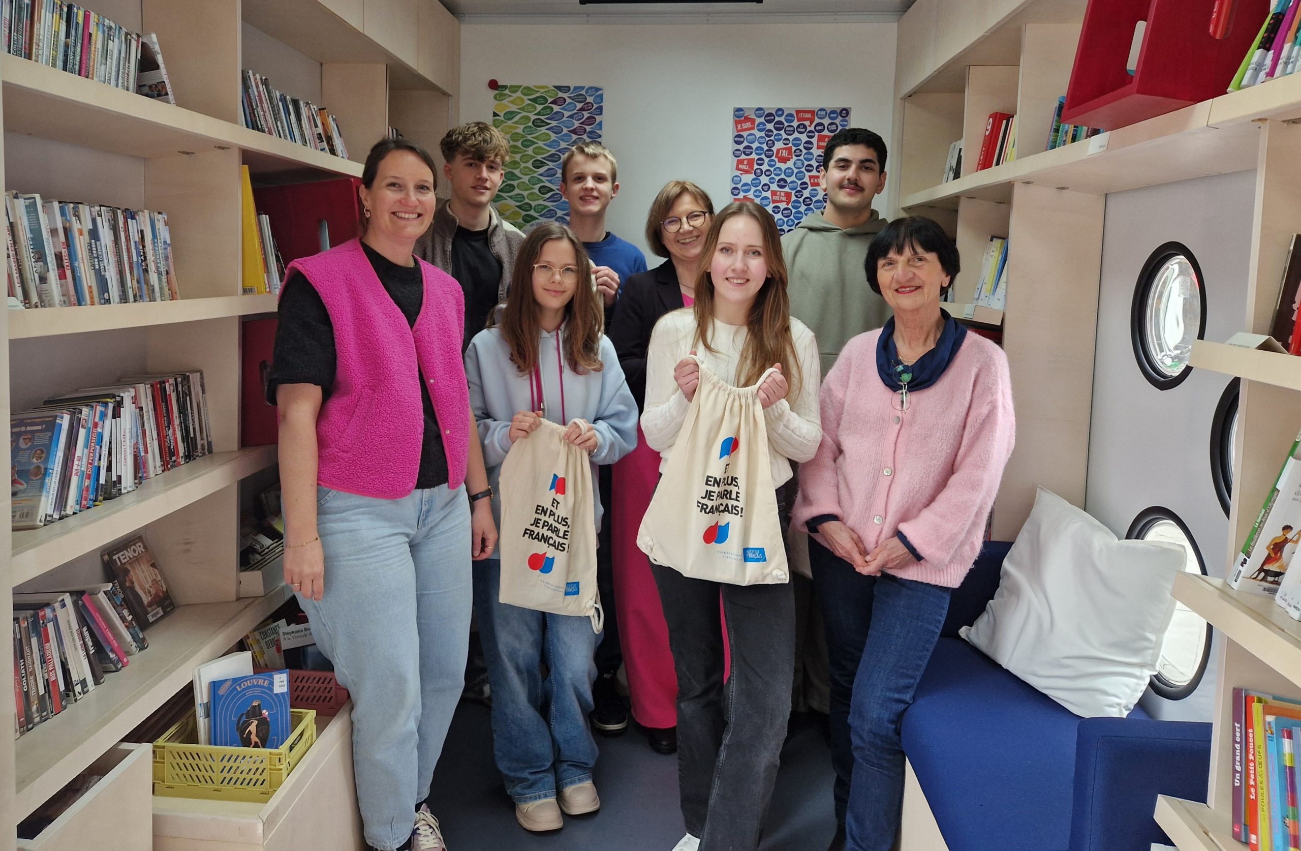 Zu erleben, war eine sehr schöne Erfahrung, da die Schülerinnen und Schüler zum ersten Mal im Bibliobus waren und sie zudem noch einen Rucksack mit Geschenken erhielten. Zur Freude der Mädchen und Jungen war darin auch ein Jugendroman enthalten: Le secret de Mona, der den PRIX DES LYCÉENS ALLEMANDS 2023 erhalten hatte.
